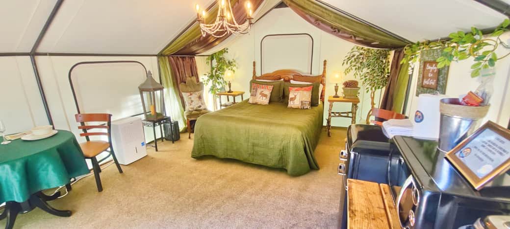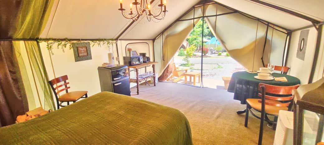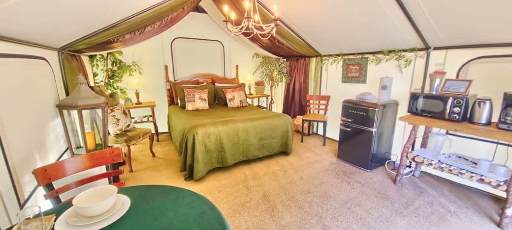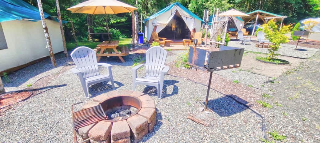 Camp in style in this one-of-a-kind glamping experience. This tent features one queen bed, sleeping up to 2 people. Microwave, toaster, coffee maker and mini fridge for your convenience. Close to flushable toilets and hot showers. Private outdoor firepit, charcoal BBQ, picnic table, umbrella. This unit comes with an electric space heater. The glamping village has flushable toilets and hot water showers, every unit has a private picnic table, fire pit and charcoal BBQ, there are also 2 community firepits and an outdoor gazebo bar with a sink available for guests to use.