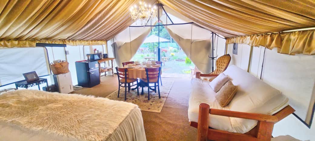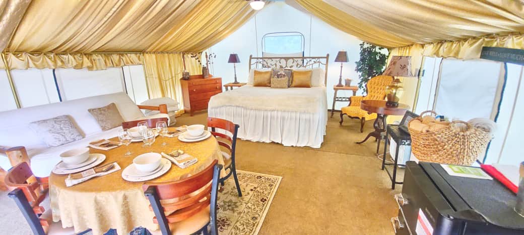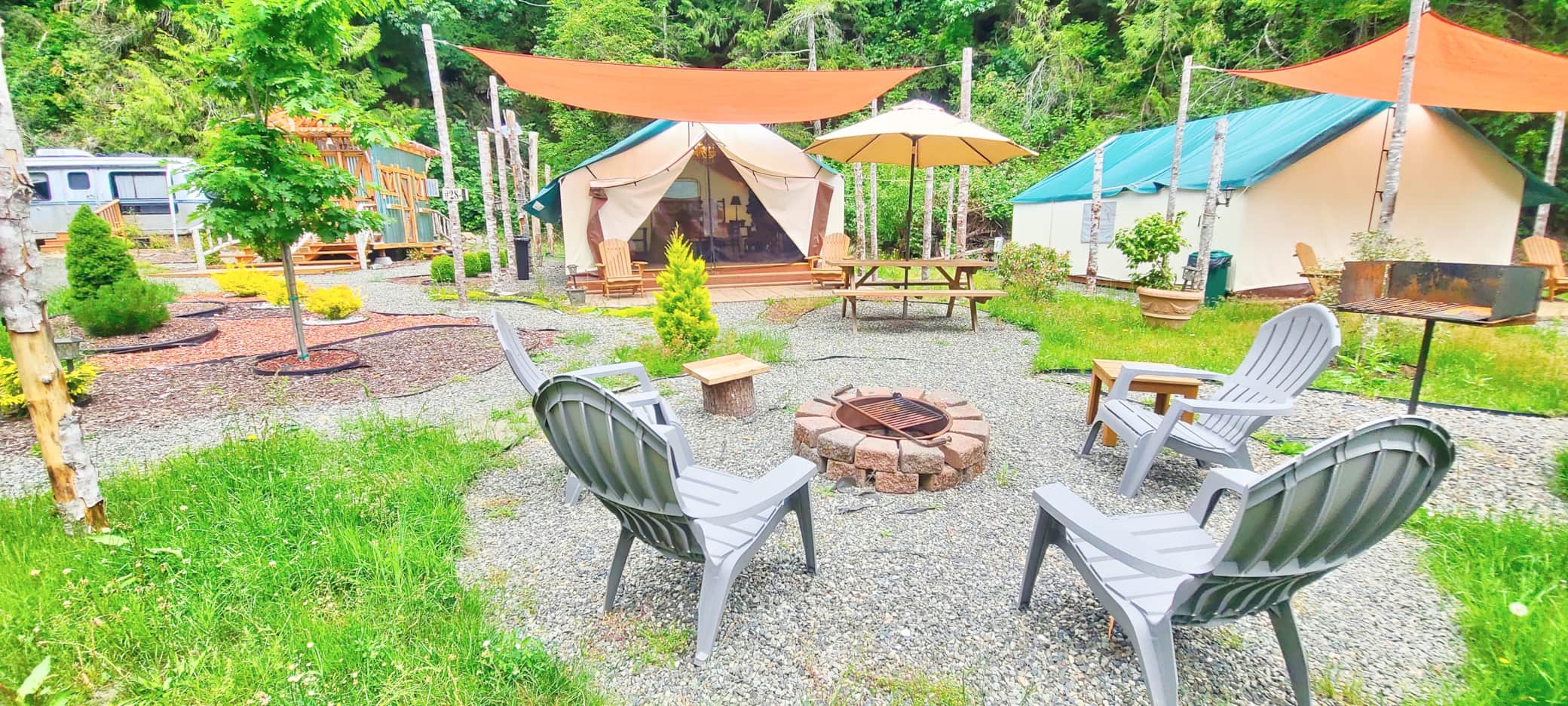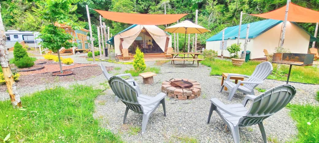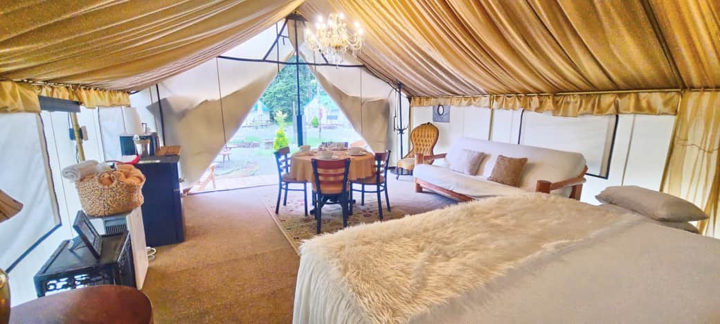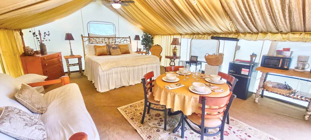 Camp in style in this one-of-a-kind glamping experience. This tent features one king bed, and one queen futon, sleeping up to 4 people. Microwave, toaster, coffee maker and mini fridge for your convenience. Close to flushable toilets and hot showers. Private outdoor firepit, charcoal BBQ, picnic table, umbrella. This unit comes with an electric space heater, and a ceiling fan. The glamping village has flushable toilets and hot water showers, every unit has a private picnic table, fire pit and charcoal BBQ, there are also 2 community firepits and an outdoor gazebo bar with a sink available for guests to use.