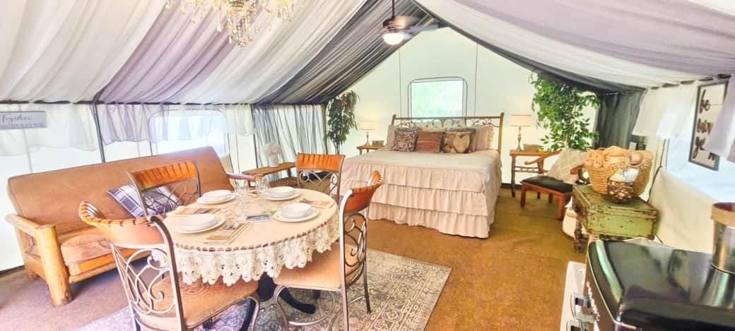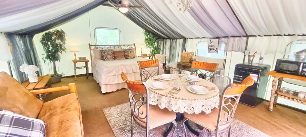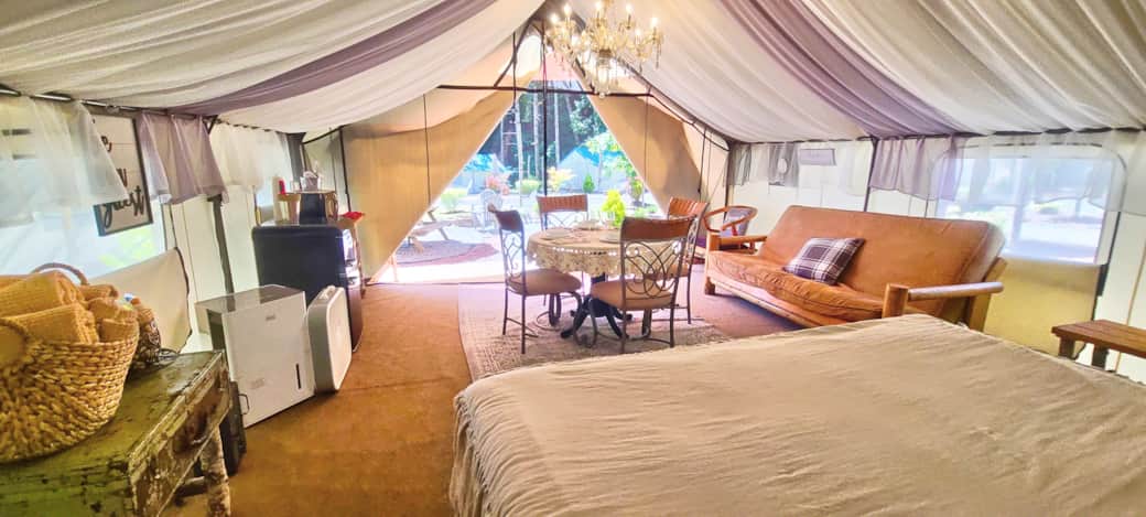 Camp in style in this one-of-a-kind glamping experience. This tent features one king bed, and one queen futon, sleeping up to 4 people. Microwave, toaster, coffee maker and mini fridge for your convenience. Close to flushable toilets and hot showers. Private outdoor firepit, charcoal BBQ, picnic table, umbrella. This unit comes with an electric space heater, and a ceiling fan. The glamping village has flushable toilets and hot water showers, every unit has a private picnic table, fire pit and charcoal BBQ, there are also 2 community firepits and an outdoor gazebo bar with a sink available for guests to use.