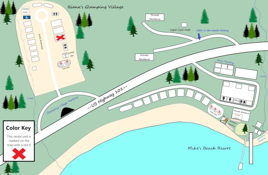 Our sister property "Mikes's Beach Resort" is located across the road. Glamping Village guests have access to Mike's Beach Resort firepits, showers, toilets, dock and beach access.