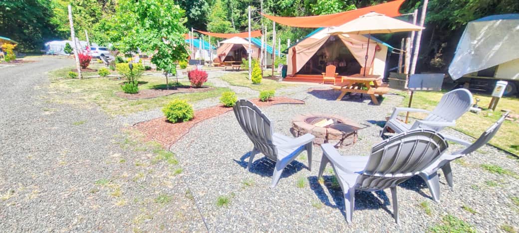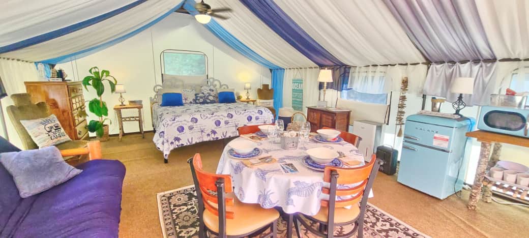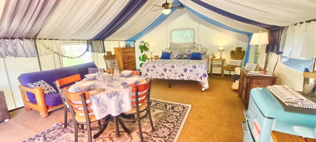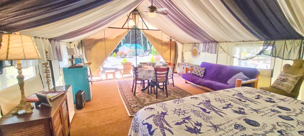 Camp in style in this one-of-a-kind glamping experience. This tent features one king bed, and one queen futon, sleeping up to 4 people. Microwave, toaster, coffee maker and mini fridge for your convenience. Close to flushable toilets and hot showers. Private outdoor firepit, charcoal BBQ, picnic table, umbrella. This unit comes with an electric space heater, and a ceiling fan. The glamping village has flushable toilets and hot water showers, every unit has a private picnic table, fire pit and charcoal BBQ, there are also 2 community firepits and an outdoor gazebo bar with a sink available for guests to use.