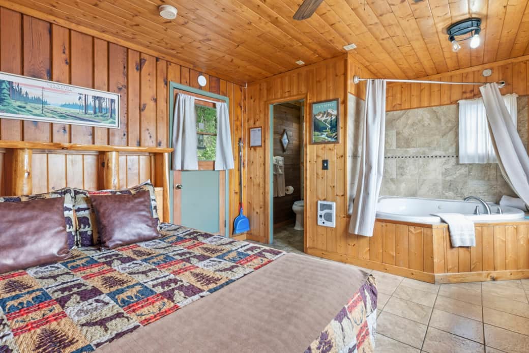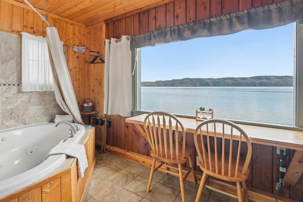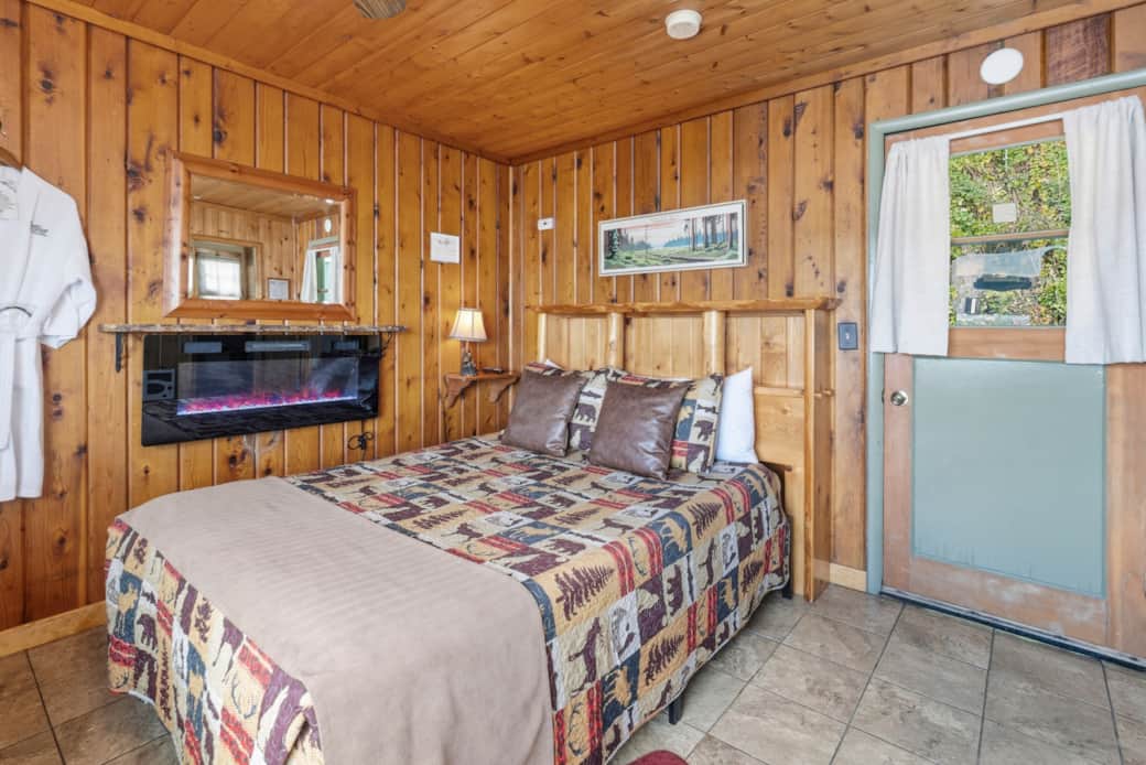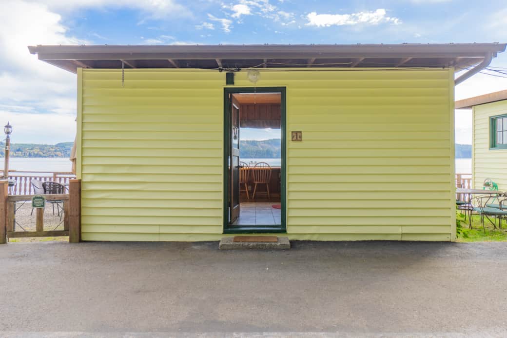 This studio style waterfront cabin is just a few feet away from the beach, features a queen size bed, accommodating up to 2 people. It has a kitchenette (microwave, coffee maker, toaster, mini-fridge and 1 burner plug in cooktop), electric wall fireplace feature, Wireless internet, full bathroom, a jetted tub, large windows, satellite tv, ceiling fan and its own fenced in outdoor area with a private fire pit, private beach access, charcoal BBQ and outdoor furniture. 1 Car parking space is included in this rental; additional cars are $10.00 per car/per day. Pets are $50.00 per pet, per reservation.