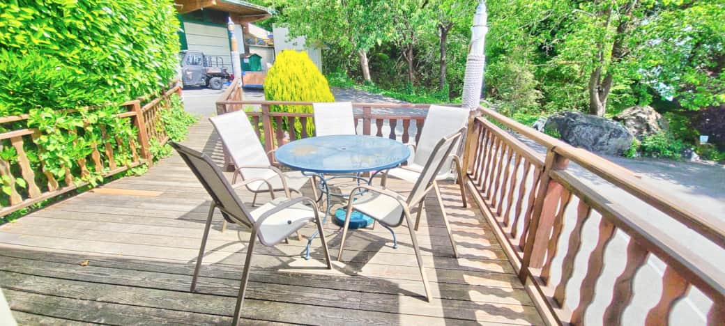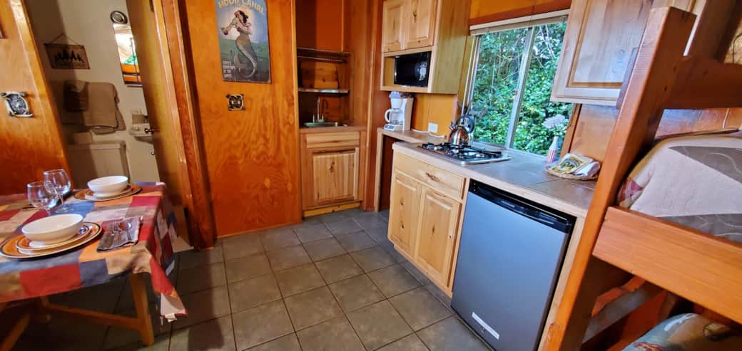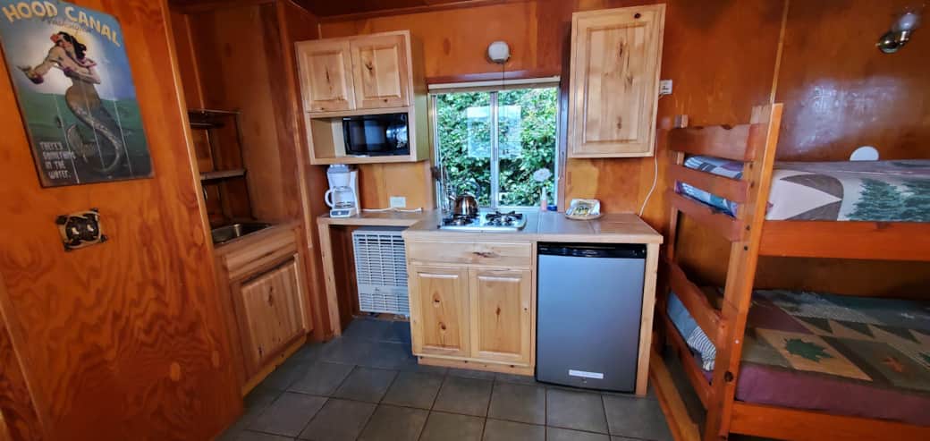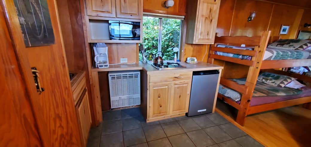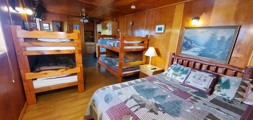 This studio style family room features 1 Queen bed and 2 sets of bunk beds (each bunk bed has 2 single beds), accommodating up to 6 people. It has a kitchenette (microwave, coffee maker, toaster, mini-fridge and 2 burner stove top with no oven), full bathroom, satellite tv, ceiling fan and a private uncovered seating area with a partial water view.
