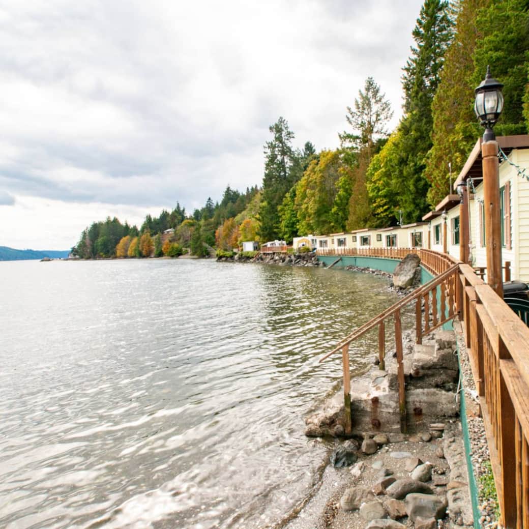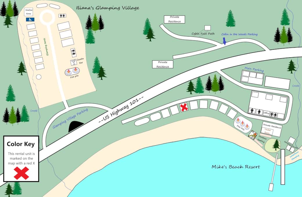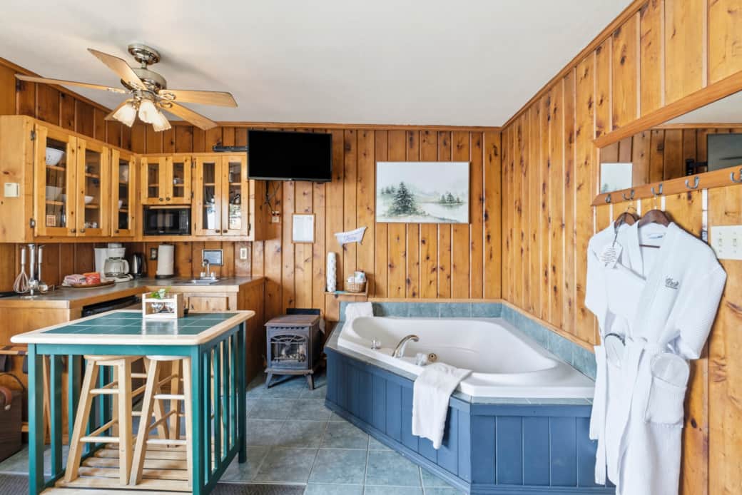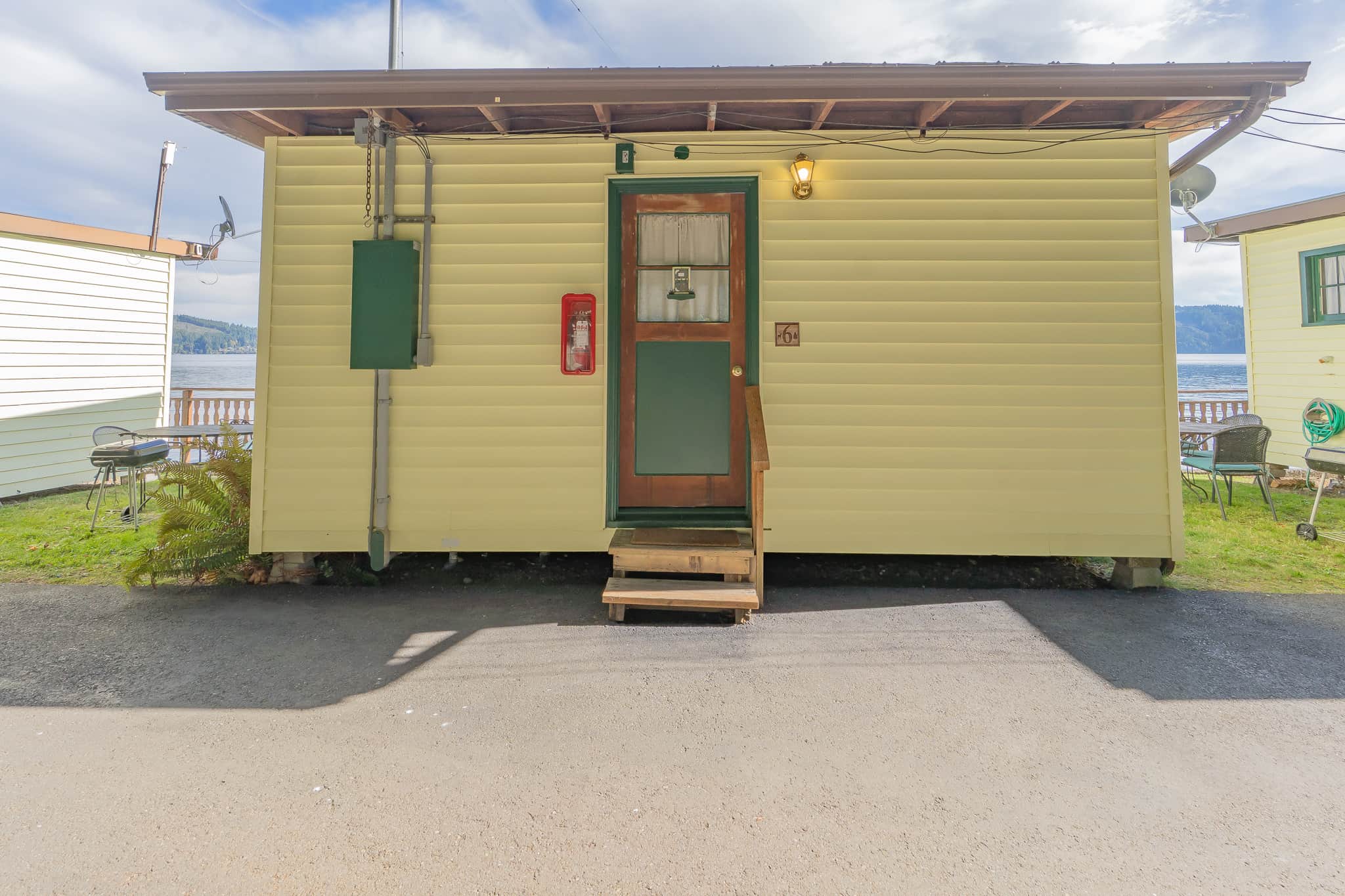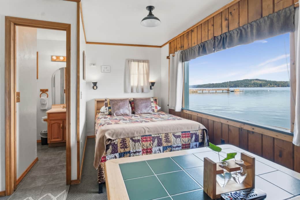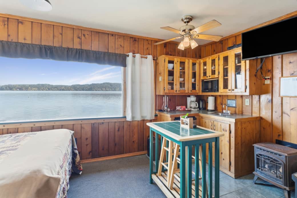 This studio style waterfront cabin is just a few feet away from the beach, features a queen size bed, accommodating up to 2 people. It has a kitchenette (microwave, coffee maker, toaster, mini-fridge and 1 burner plug in cooktop), electric wall fireplace feature, Wireless internet, full bathroom, a jetted tub, large windows, satellite tv, ceiling fan, charcoal BBQ and outdoor furniture. Private area with picnic table and chairs next to the cabin.