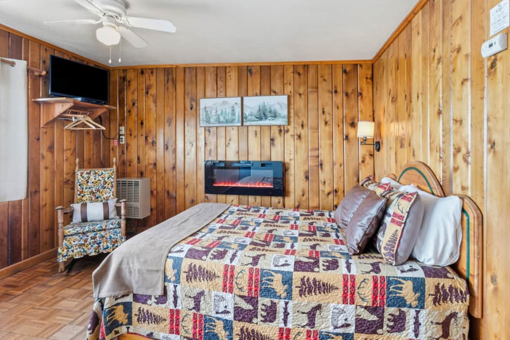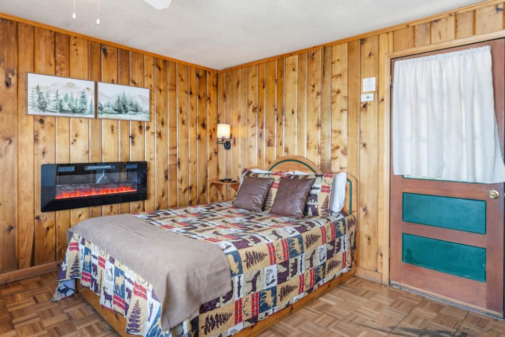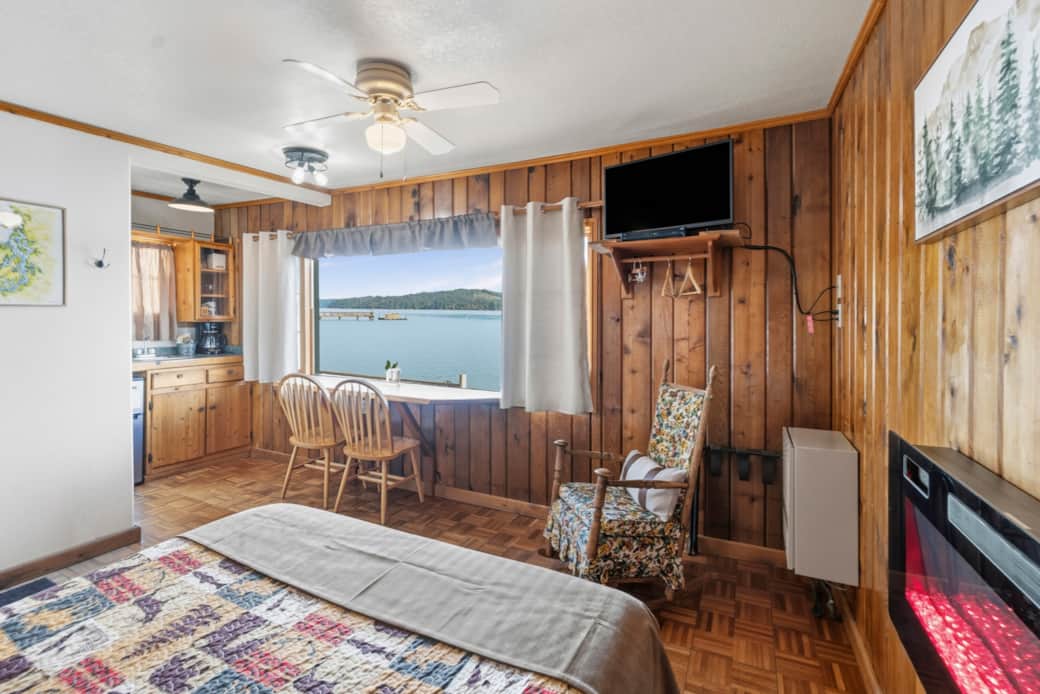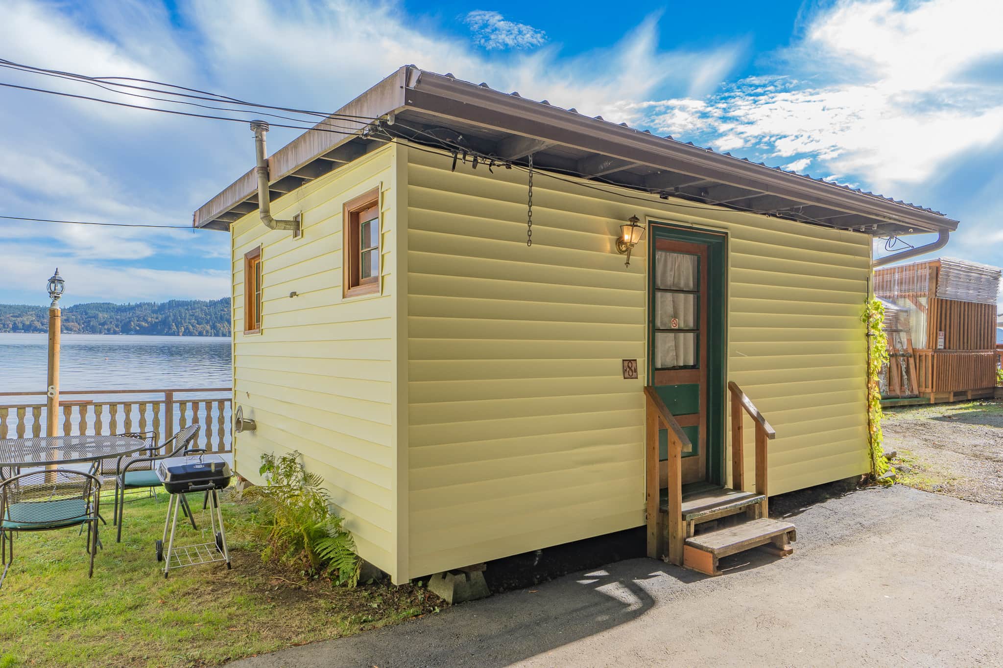 This studio style waterfront cabin is just a few feet away from the beach, features a queen size bed, accommodating up to 2 people. It has a kitchenette (microwave, coffee maker, toaster, mini-fridge and 1 burner plug in cooktop), electric wall fireplace feature, Wireless internet, full bathroom, large windows, satellite tv, ceiling fan, charcoal BBQ and outdoor furniture. Private area with picnic table and chairs next to the cabin.